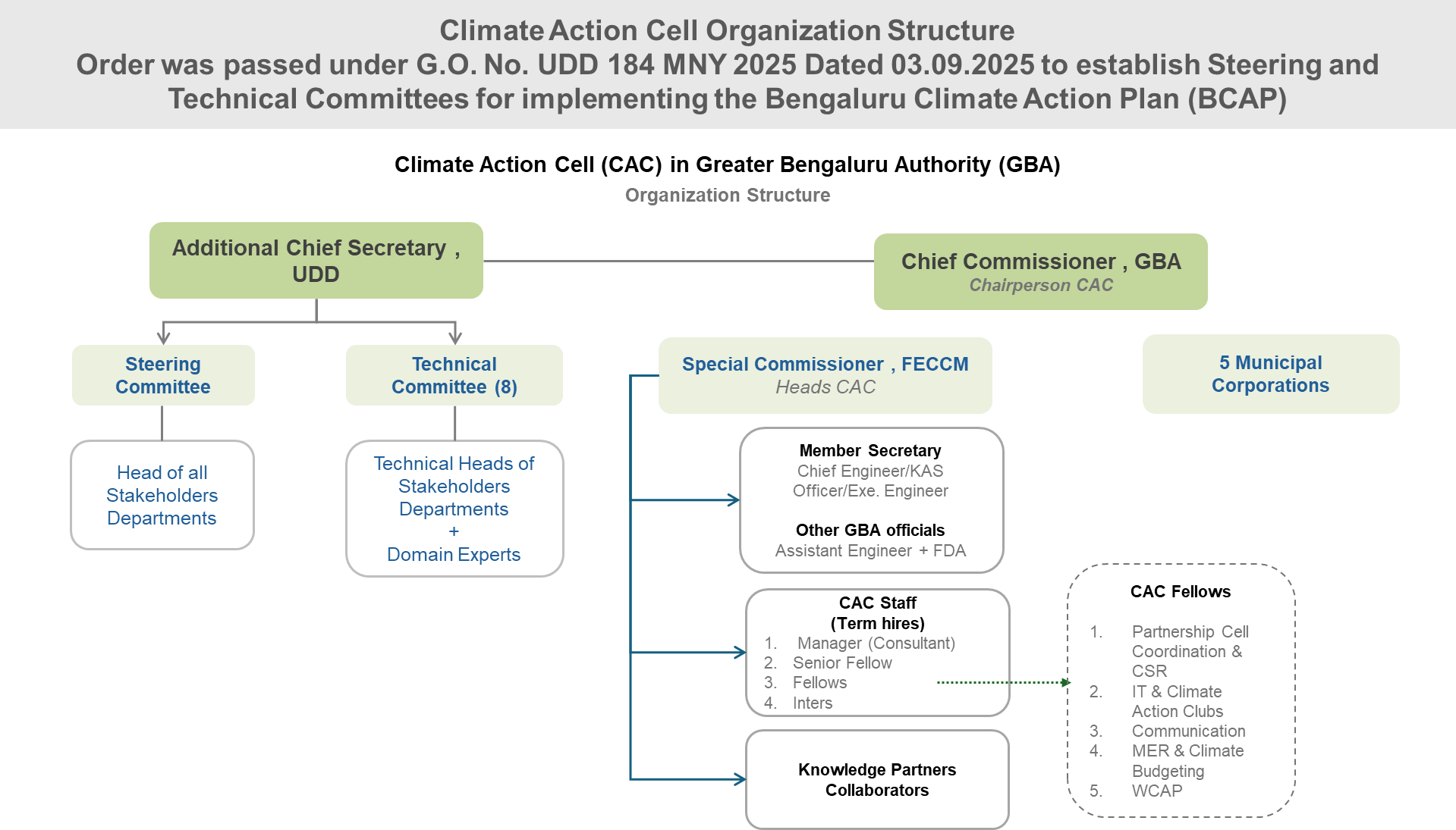 To facilitate and drive forward climate action and resilience in the city, the Climate Action Cell (CAC) has been constituted by the Hon’ble Chief Commissioner of BBMP, Shri Tushar Girinath, as per vide order no. CE/PR/216/2023-24 dated 01/02/2024 , where the Bengaluru Climate Action Plan (BCAP) stands a guiding document to drive this multi stakeholder process.The Cell functions under the Chairpersonship of the Special Commissioner, Forest, Environment, and Climate Change Management Wing of BBMP, Smt. Preeti Gehlot, IAS, with representation from all relevant stakeholder departments.
